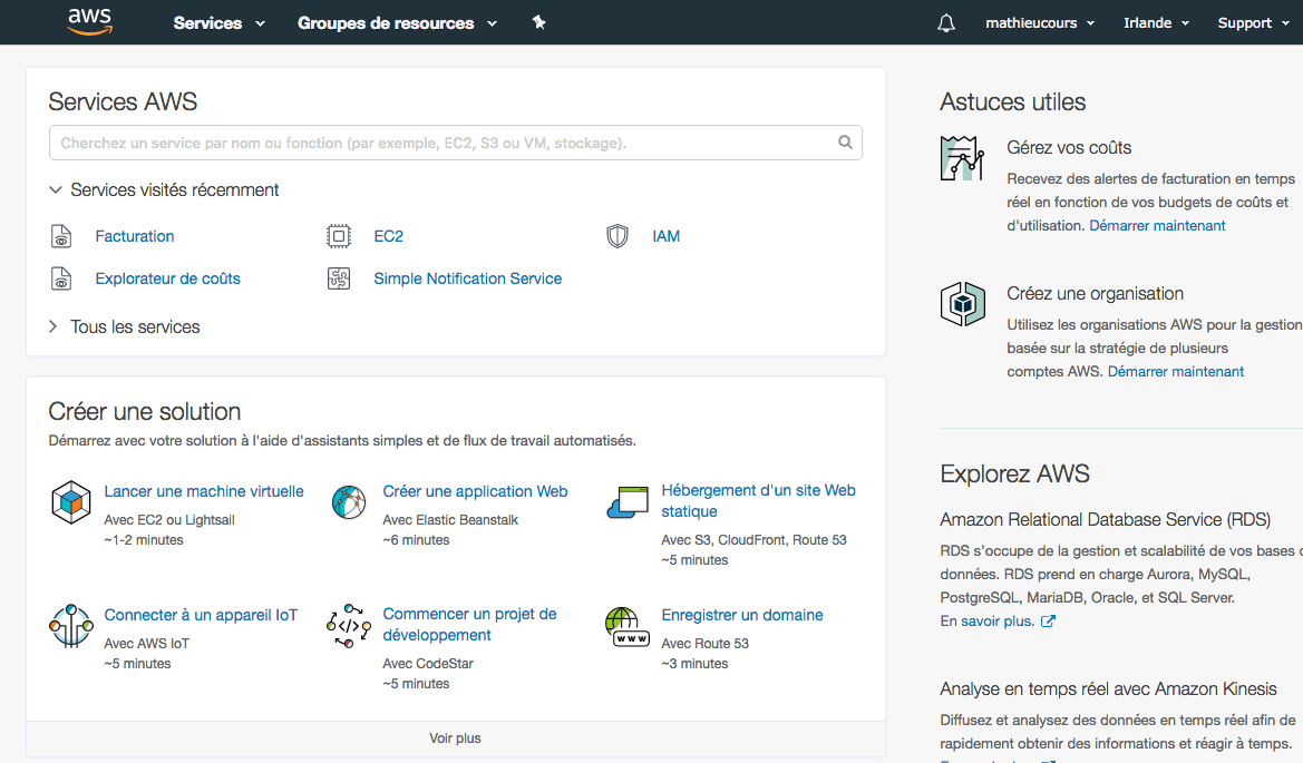 La section principale affiche tous les services d'AWS. Les plus populaires sont sans aucun doute : EC2, RDS et S3. Nous les découvrirons dans ce cours. Vous pouvez accéder à ces services depuis le menu "Services" tout en haut.