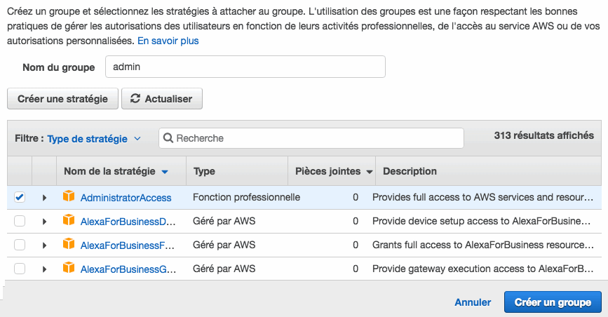 Une autre façon de le faire c'est qu'au lieu d'utiliser les policy par service on a des politiques qui sont par fonctions. AWS a défini un ensemble de politiques qui regroupe les permissions sur les services concernés. Libre à vous ensuite de spécialiser ses stratégies et de les affiner.